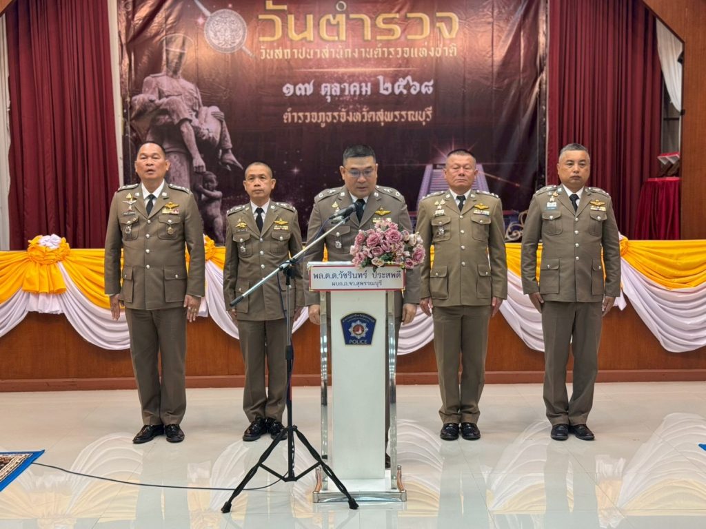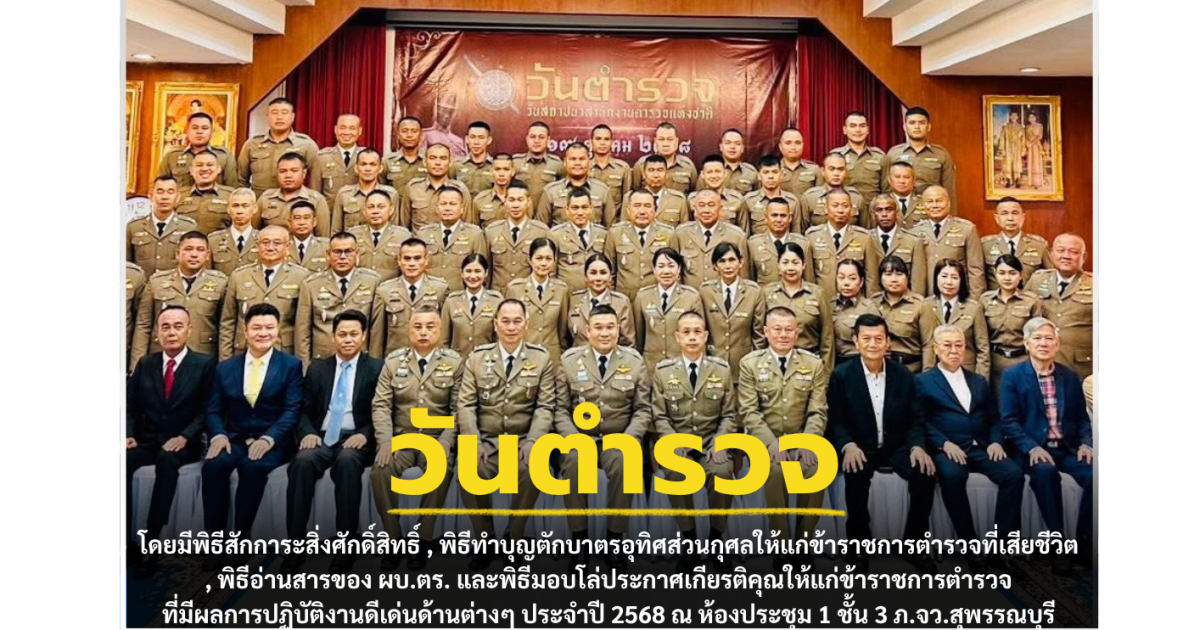 วันที่ 17 ต.ค.68 เวลา 08.30 น. พล.ต.ต.วัชรินทร์ ประสพดี ผบก.ภ.จว.สุพรรณบุรี เป็นประธาน พร้อมด้วย รอง ผบก.ภ.จว.สุพรรณบุรี , ผกก.(สอบสวน)ฯ , ข้าราชการตำรวจ ฝอ.ภ.จว.สุพรรณบุรี และแขกผู้มีเกียรติ กต.ตร.จังหวัดสุพรรณบุรี เข้าร่วมการจัดกิจกรรมงานวันตำรวจ ของ ภ.จว.สุพรรณบุรี ประจำปี 2568 โดยมีพิธีสักการะสิ่งศักดิ์สิทธิ์ , พิธีทำบุญตักบาตรอุทิศส่วนกุศลให้แก่ข้าราชการตำรวจที่เสียชีวิต , พิธีอ่านสารของ ผบ.ตร. และพิธีมอบโล่ประกาศเกียรติคุณให้แก่ข้าราชการตำรวจที่มีผลการปฏิบัติงานดีเด่นด้านต่างๆ ประจำปี 2568 ณ ห้องประชุม 1 ชั้น 3 อาคารตำรวจภูธรจังหวัดสุพรรณบุรี อ.เมือง จ.สุพรรณบุรี