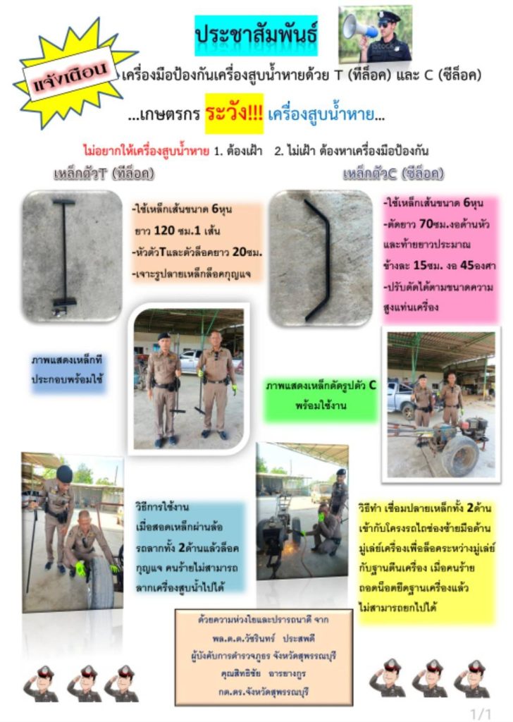 วันที่ 19 มี.ค.67 เวลา 14.00 น. พล.ต.ต.วัชรินทร์ ประสพดี ผบก.ภ.จว.สุพรรณบุรี พร้อมด้วย คุณสิทธิชัย อารยางกูร, คุณพรปวีณ์ สถาปนพิทักษ์กิจ, คุณเดชา ขันติกาโร กต.ตร.จังหวัดสุพรรณบุรี และ พ.ต.อ.สมพร พุกหอม, พ.ต.อ.ศักดิ์ชัย อินทรปรีชา รอง ผบก.ภ.จว.สุพรรณบุรี , พ.ต.อ.สมเดช เกษมสุข ผกก.(สอบสวน)ฯ, พ.ต.อ.ยุทธนา สันติปรีชาวัฒน์ ผกก.ฝอ.ฯ ร่วมประชุมหาแนวทางการป้องกัน การโจรกรรมเครื่องมือทางการเกษตร (เครื่องสูบน้ำ) ในพื้นที่ โดยมีข้าราชการตำรวจ สภ.ศรีประจันต์ สาธิตการใช้อุปกรณ์เสริมการป้องกันในท้องที่ ที่สามารถนำมาประยุกต์ใช้ให้เกิดประโยชน์ และจะนำวิธีการดังกล่าวเผยแพร่ให้ประชาชน ตำรวจ และผู้นำชุมชนไปปรับใช้ต่อไป