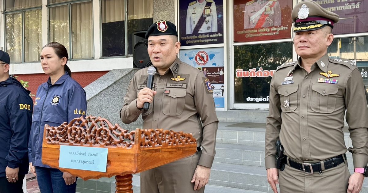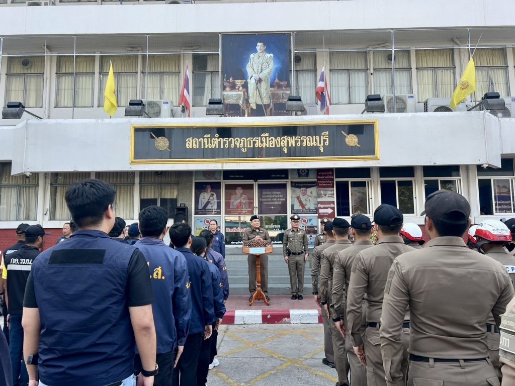 วันที่ (28 ก.พ.68) เวลา 09.30 น. พล.ต.ต.วัชรินทร์ ประสพดี ผบก.ภ.จว.สุพรรณบุรี เป็นประธาน พิธีปล่อยแถวระดมกวาดล้าง ตามมาตรการแก้ไขปัญหาคนต่างด้าวหลบหนีเข้าเมืองโดยผิดกฏหมาย และคนต่างด้าวถูกหลอกลวง หรือประกอบธุรกิจผิดกฎหมาย และอาชญากรรมข้ามชาติ โดยมี พ.ต.อ.ยิ่งยส เขินอำนวย รอง ผบก.ภ.จว.สุพรรณบุรี , พ.ต.อ.กฤศ จันทร์สว่าง รอง ผบก.ภ.จว.สุพรรณบุรี รรท.ผกก.สภ.เมืองสุพรรณบุรี , พ.ต.อ.เจษฎา พานิชวงศ์ ผกก.(สอบสวน)ฯ ภ.จว.สุพรรณบุรี และข้าราชการตำรวจ ในสังกัด ภ.จว.สุพรรณบุรี พร้อมด้วย หน่วยงานราชการ ดังนี้ ตำรวจสันติบาลสุพรรณบุรี ตม.สุพรรณบุรี ฝ่ายปกครองอำเภอเมืองสุพรรณบุรี ฝ่ายจัดหางานจังหวัดสุพรรณบุรี ฝ่ายแรงงานจังหวัดสุพรรณบุรี พัฒนาสังคมและความมั่นคงของมนุษย์จังหวัดสุพรรณบุรี กอ.รมน.จว.สุพรรณบุรี ณ บริเวณลานด้านหน้าอาคาร สภ.เมืองสุพรรณบุรี อ.เมือง จ.สุพรรณบุรี