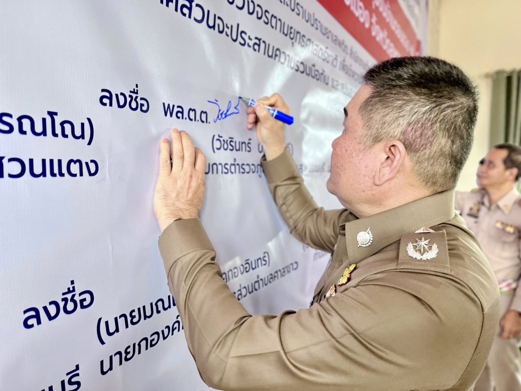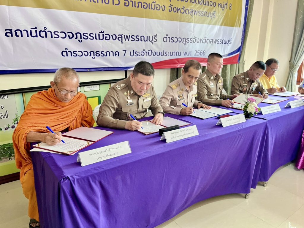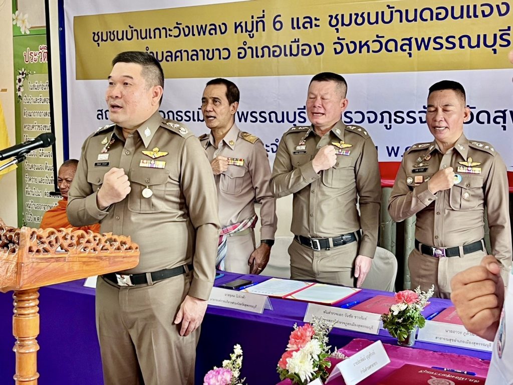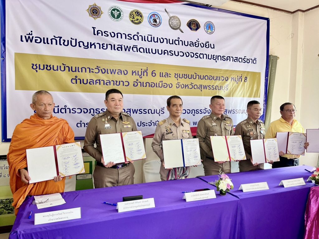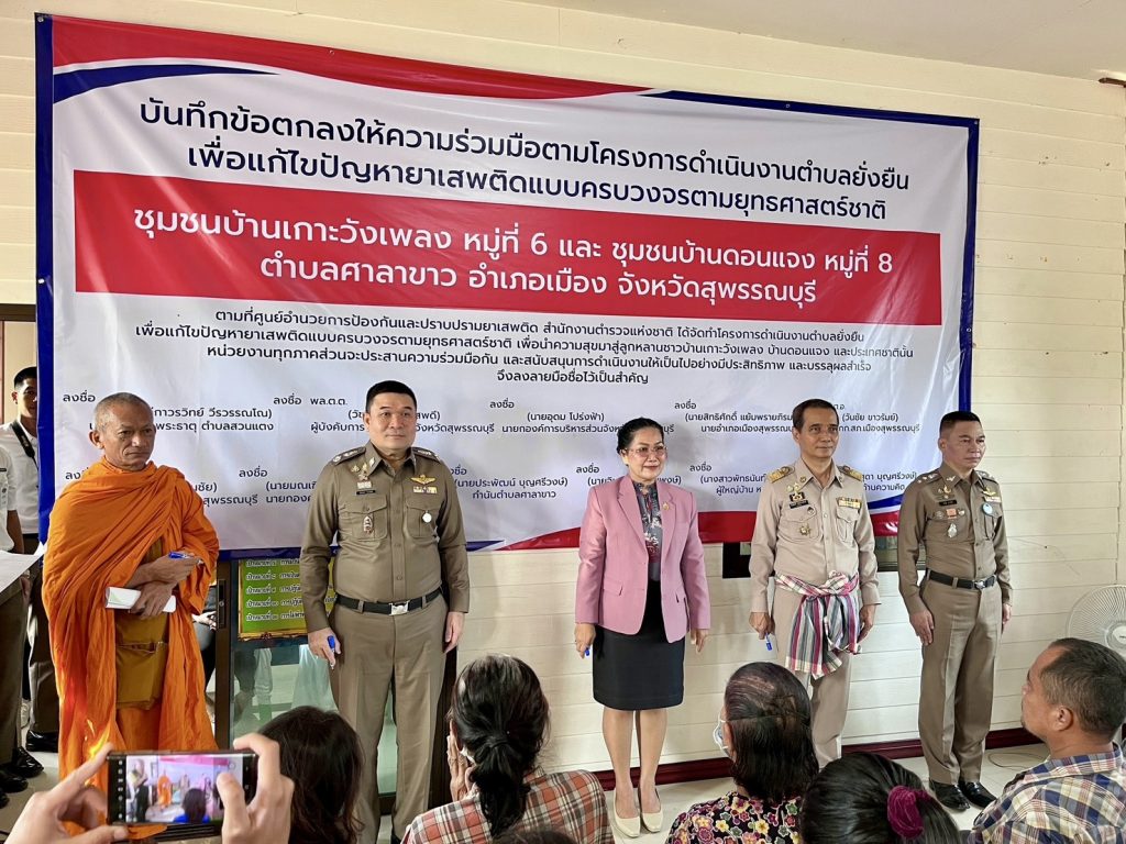 วันที่ (12 มี.ค.68) เวลา 09.00 น. พล.ต.ต.วัชรินทร์ ประสพดี ผบก.ภ.จว.สุพรรณบุรี เป็นประธาน พิธีเปิดโครงการดำเนินงานตำบลยั่งยืน เพื่อแก้ไขปัญหายาเสพติดแบบครบวงจรตามยุทธศาสตร์ชาติ ของสถานีตำรวจภูธรเมืองสุพรรณบุรี พื้นที่เป้าหมาย ชุมชนบ้านเกาะวังเพลง หมู่ที่ 6 และชุมชนบ้านดอนแจง หมู่ที่ 8 ตำบลศาลาขาว โดยมี นายสิทธิศักดิ์ แย้มพรายภิรมย์ นายอำเภอเมืองสุพรรณบุรี , พ.ต.อ.ยิ่งยส เขินอำนวย รอง ผบก.ภ.จว.สุพรรณบุรี , พ.ต.อ.วันชัย ขาวรัมย์ ผกก.สภ.เมืองสุพรรณบุรี , ฝ่ายปกครอง , สาธารณสุข , ผู้นำชุมชน และประชาชนในพื้นที่ เข้าร่วม ณ สถานที่ทำการศูนย์ปฏิบัติการตำบลยั่งยืน ศาลาร่วมใจพัฒนาบ้านดอนแจง ต.ศาลาขาว อ.เมือง จ.สุพรรณบุรี