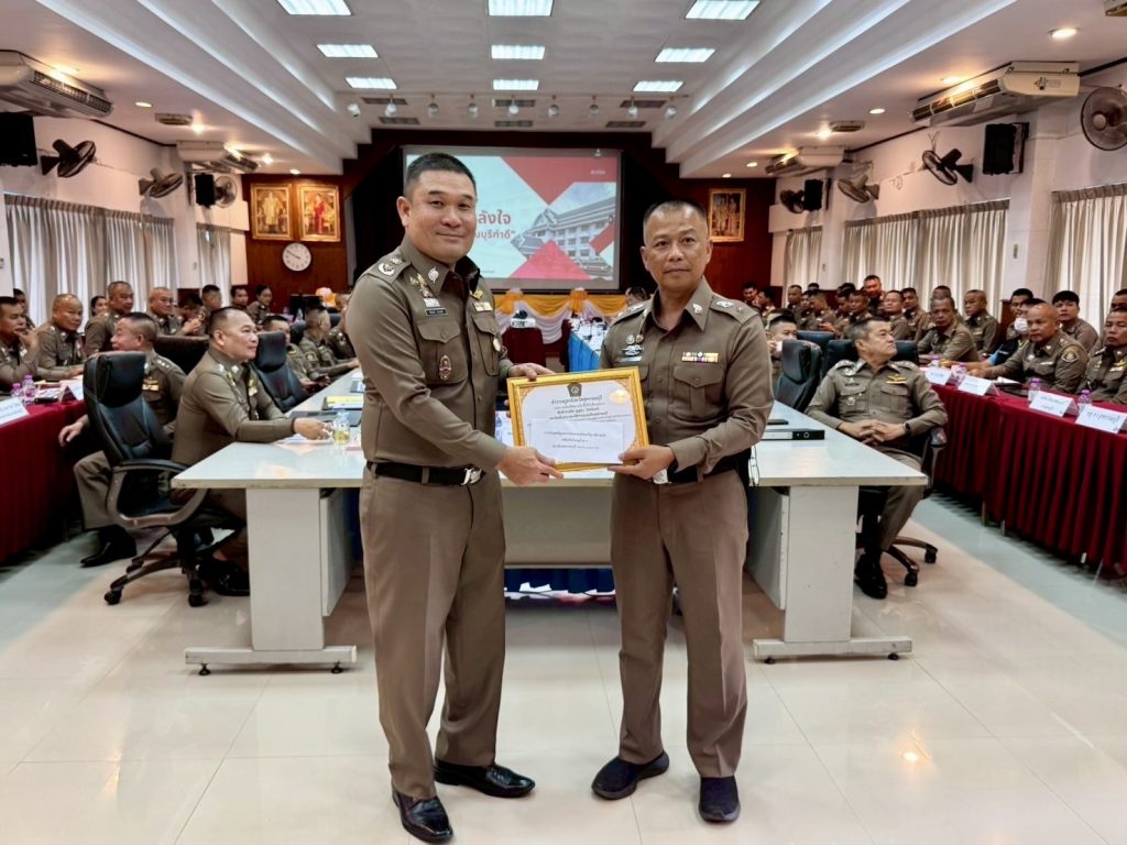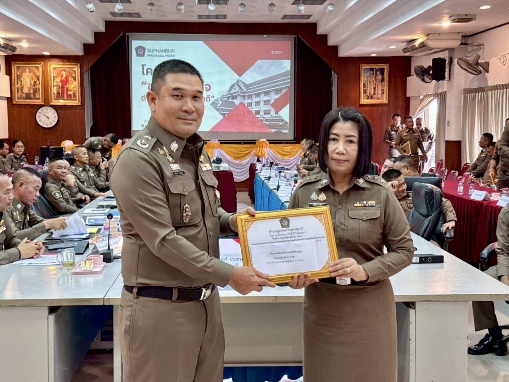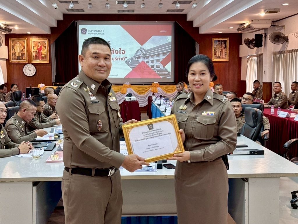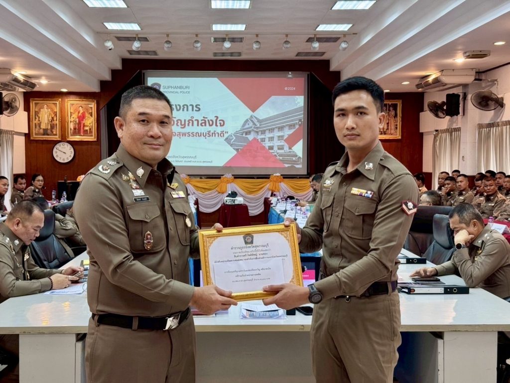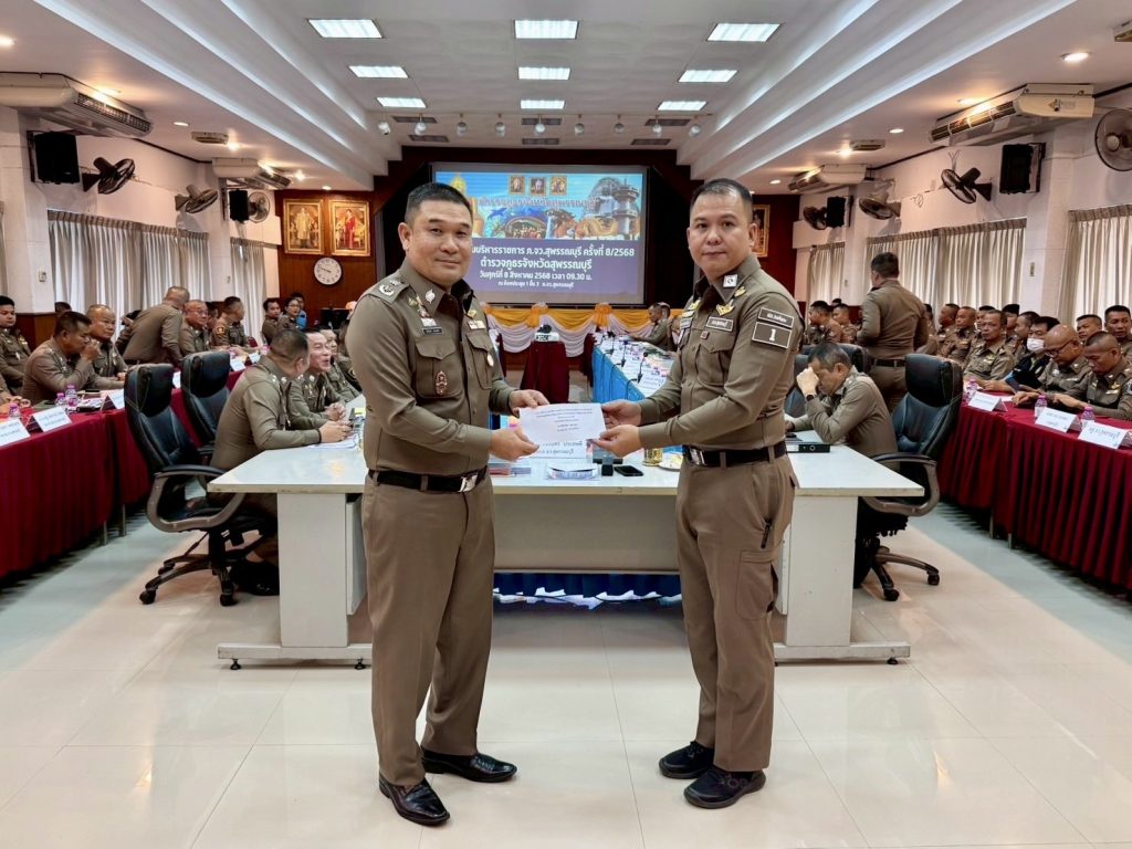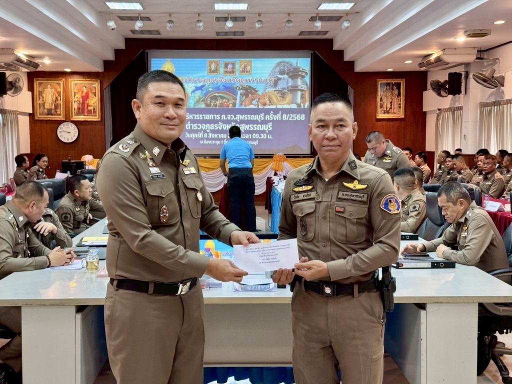 วันที่ (8 ส.ค.68) เวลา 09.30 น. พล.ต.ต.วัชรินทร์ ประสพดี ผบก.ภ.จว.สุพรรณบุรี เป็นประธานการประชุม พร้อมด้วย รอง ผบก.ภ.จว.สุพรรณบุรี , หน.สภ.ฯ ในสังกัด , ผกก.สืบสวนฯ , ผกก.(สอบสวน)ฯ , ผกก./รอง ผกก./สว. ฝอ.ภ.จว.สุพรรณบุรี และหน่วยเกี่ยวข้อง ร่วมประชุมบริหารราชการ ภ.จว.สุพรรณบุรี ครั้งที่ 8/2568 ประจำเดือน ส.ค.68 เพื่อเร่งรัดและติดตามผลการปฏิบัติงาน และกำชับข้าราชการตำรวจในสังกัดปฏิบัติหน้าที่อย่างเคร่งครัด โดยวาระก่อนการประชุม ได้มีการมอบเงินทุนการศึกษาบุตร-ธิดา ของข้าราชการตำรวจที่มีผลการปฏิบัติงานดีเด่นตามโครงการขวัญกำลังใจ ตำรวจสุพรรณบุรีทำดี จากพระครูศรีรัตนาภิวัฒน์ รองเจ้าคณะจังหวัดสุพรรณบุรี เจ้าอาวาสวัดพระลอย จำนวน 13 ทุนๆละ 1,000 บาท รวมเป็นเงิน 13,000 บาท โดยมี หน.สภ. เป็นผู้แทนรับมอบ และได้มีการมอบเกียรติบัตรและเงินรางวัลให้แก่ข้าราชการตำรวจตามโครงการ “ขวัญกำลังใจ ตำรวจสุพรรณบุรีทำดี” ที่มีผลการปฏิบัติในรอบเดือน ก.ค.68 ซึ่งผ่านการพิจารณาจากคณะกรรมการฯ มีรายละเอียด ดังนี้ 1.จับกุมอาวุธปืน 39 กระบอก เงินรางวัล 37,800 บาท 2.จับกุมคดีอุกฉกรรจ์สะเทือนขวัญ/คดีน่าสนใจ ดังนี้ 2.1 คดีร่วมกันจำหน่ายยาเสพติดเครือข่าย “เก่ง ด่านช้าง” (ยาบ้า 4,033 เม็ด และเคตามีน จำนวน 51.89 กรัม) เป็นเงิน 10,000 บาท 2.2 คดีร่วมกันจำหน่ายยาเสพติดเครือข่าย “เก่ง ด่านช้าง” (ยาบ้า 8,800 เม็ด) เป็นเงิน 5,000 บาท 2.3 คดีร่วมกันมีอาวุธปืนและยิงปืนในหมู่บ้านฯ เป็นเงิน 3,000 บาท 2.4 คดีร่วมกันจำหน่ายยาเสพติด (ยาบ้า 4 ล้านเม็ด) เป็นเงิน 5,000 บาท 2.5 คดีลักทรัพย์ในเคหะสถาน ในเวลากลางคืน (มาตรน้ำ) เป็นเงิน 5,000 บาท 2.6 คดีพยายามฆ่าผู้อื่น เป็นเงิน 3,000 บาท 2.7 จับกุมผู้ต้องหาตามหมายจับ 2 ราย รวม จำนวน 9 หมาย เป็นเงิน 3,000 บาท 3.การสร้างภาพลักษณ์ที่ดีต่อองค์กร 2 รางวัล เป็นเงิน 2,000 บาท 4.การปฏิบัติหน้าที่ด้านอำนวยการและสนับสนุน 8 รางวัล เป็นเงิน 8,000 บาท 5.การปฏิบัติหน้าที่ด้านงานสอบสวน 6 รางวัล เป็นเงิน 6,000 บาท 6.การปฏิบัติหน้าที่ด้านงานจราจร 2 รางวัล เป็นเงิน 2,000 บาท 7.การปฏิบัติหน้าที่ด้านงานป้องกันปราบปราม 4 รางวัล เป็นเงิน 4,000 บาท 8.การปฏิบัติหน้าที่ด้านงานสืบสวน 4 รางวัล เป็นเงิน 4,000 บาท 9.การจัดทำคลิปวีดิโอประชาสัมพันธ์ 10 รางวัล เป็นเงิน 23,000 บาท รวมเป็นเงินรางวัล จำนวน 120,800 บาท ณ ห้องประชุม 1 ชั้น 3 ภ.จว.สุพรรณบุรี