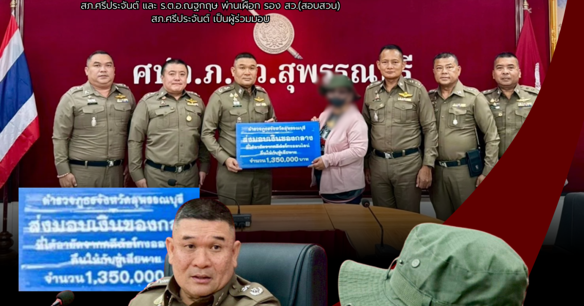 วันที่ 23 ธ.ค.68 เวลา 11.30 น. พล.ต.ต.วัชรินทร์ ประสพดี ผบก.ภ.จว.สุพรรณบุรี พร้อมด้วย พ.ต.อ.พีระ อัศวพิบูลย์ผล รอง ผบก.ภ.จว.สุพรรณบุรี , พ.ต.อ.โด่งดัง โกกะพันธ์ ผกก.(สอบสวน)ฯ , พ.ต.อ.เอกชัย ศรีเมือง ผกก.สภ.ศรีประจันต์ , พ.ต.ท.บรรจง สิทธิศักดิ์ รอง ผกก.(สอบสวน) สภ.ศรีประจันต์ และ ร.ต.อ.ณฐกฤษ พ่านเผือก รอง สว.(สอบสวน) สภ.ศรีประจันต์ ได้ส่งมอบเงินของกลางที่ได้จากการอายัดบัญชีธนาคาร ในคดีหลอกลวงให้ร่วมลงทุนทางออนไลน์ โดยส่งมอบคืนให้กับผู้เสียหาย เป็นเงิน จำนวน 1,350,000 บาท