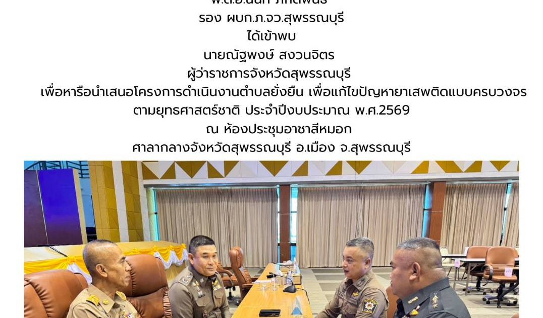 เข้าพบ นายณัฐพงษ์ สงวนจิตร ผู้ว่าราชการจังหวัดสุพรรณบุรี เพื่อหารือนำเสนอโครงการดำเนินงานตำบลยั่งยืน เพื่อแก้ไขปัญหายาเสพติดแบบครบวงจร ตามยุทธศาสตร์ชาติ ประจำปีงบประมาณ พ.ศ.2569