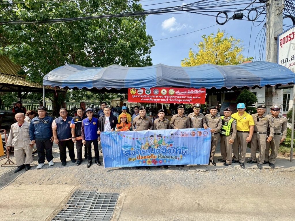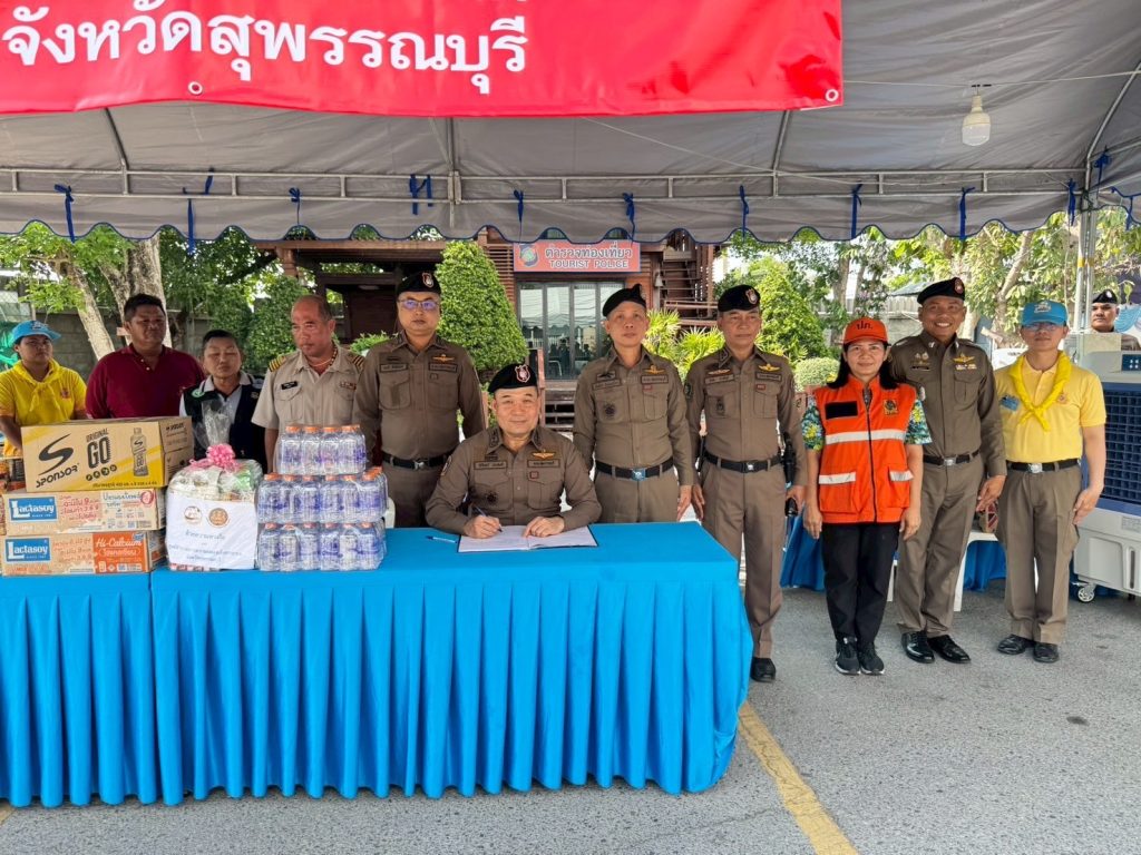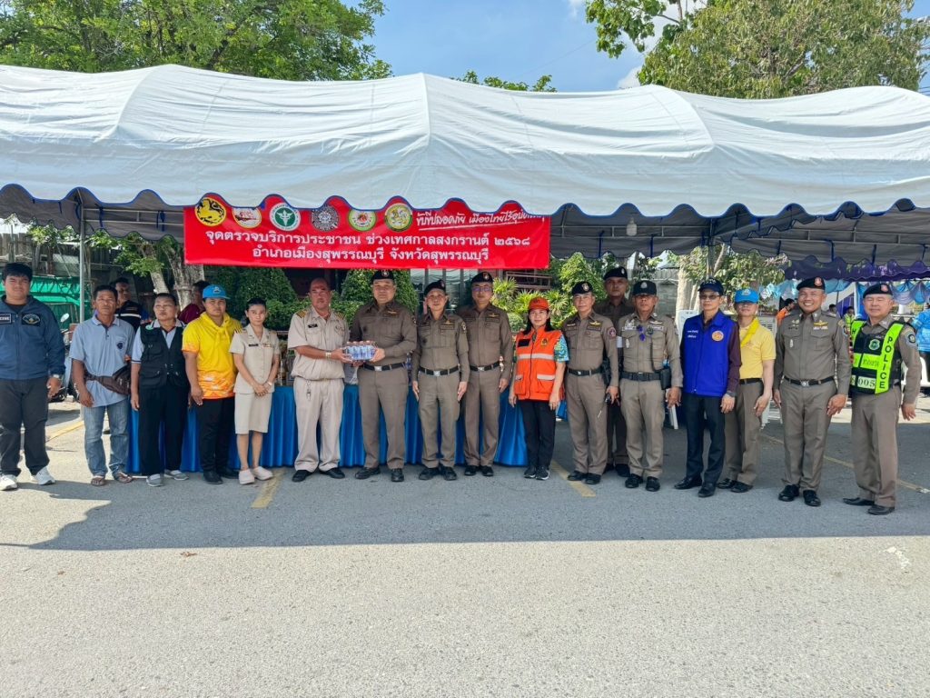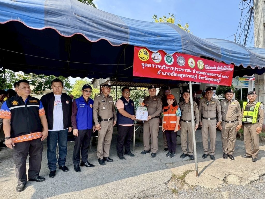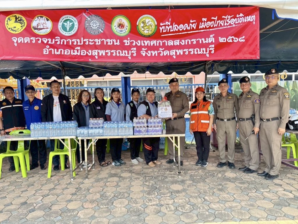 วันที่ (11 เม.ย.68) ระหว่างเวลา 14.00 - 16.00 น. พล.ต.ต.วัชรินทร์ ประสพดี ผบก.ภ.จว.สุพรรณบุรี พร้อมด้วย พ.ต.อ.ศักดิ์ชัย อินทรปรีชา , พ.ต.อ.นนท์ ภักดีพันธ์ รอง ผบก.ภ.จว.สุพรรณบุรี , พ.ต.ต.โจ เสาร์ประโคน สว.ส.ทล.6 กก.2 บก.ทล. ร่วมกับผู้แทนสรรพสามิต พื้นที่สุพรรณบุรี และผู้แทนสำนักงานป้องกันและบรรเทาสาธารณภัยจังหวัดสุพรรณบุรี ได้เดินทางไปตรวจเยี่ยมจุดตรวจ/จุดบริการประชาชน ช่วงเทศกาลสงกรานต์ 2568 ในเขตพื้นที่อำเภอเมืองสุพรรณบุรี จำนวน 3 แห่ง พบ พ.ต.อ.วันชัย ขาวรัมย์ ผกก.สภ.เมืองสุพรรณบุรี , ว่าที่ พ.ต.อ.สามิตร ไชยอิ่นคำ ผกก.สภ.สระแก้ว พร้อมข้าราชการตำรวจ , ฝ่ายปกครอง , สาธารณสุข และอาสาสมัคร อยู่ปฏิบัติหน้าที่ จึงได้มอบสิ่งของ เพื่อเป็นขวัญกำลังใจในการปฏิบัติหน้าที่ พร้อมได้กำชับให้ดูแลอำนวยความสะดวกด้านการจราจรและการให้บริการประชาชน