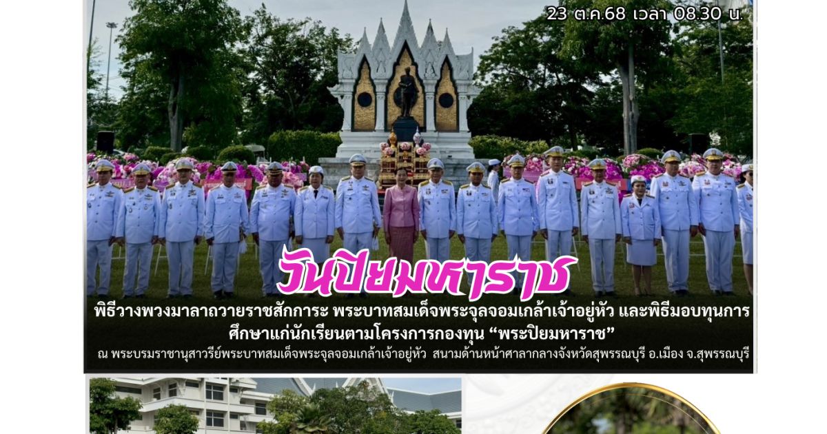วันที่ 23 ต.ค.68 เวลา 08.30 น. พล.ต.ต.วัชรินทร์ ประสพดี ผบก.ภ.จว.สุพรรณบุรี พร้อมด้วย ข้าราชการตำรวจ ภ.จว.สุพรรณบุรี และ สภ.เมืองสุพรรณบุรี เข้าร่วมกิจกรรมเนื่องในวันปิยมหาราช พิธีวางพวงมาลาถวายราชสักการะ พระบาทสมเด็จพระจุลจอมเกล้าเจ้าอยู่หัว และพิธีมอบทุนการศึกษาแก่นักเรียนตามโครงการกองทุน “พระปิยมหาราช” โดยมี นายพิริยะ ฉันทดิลก ผู้ว่าราชการจังหวัดสุพรรณบุรี เป็นประธานในพิธีฯ ณ พระบรมราชานุสาวรีย์พระบาทสมเด็จพระจุลจอมเกล้าเจ้าอยู่หัว สนามด้านหน้าศาลากลางจังหวัดสุพรรณบุรี อ.เมือง จ.สุพรรณบุรี