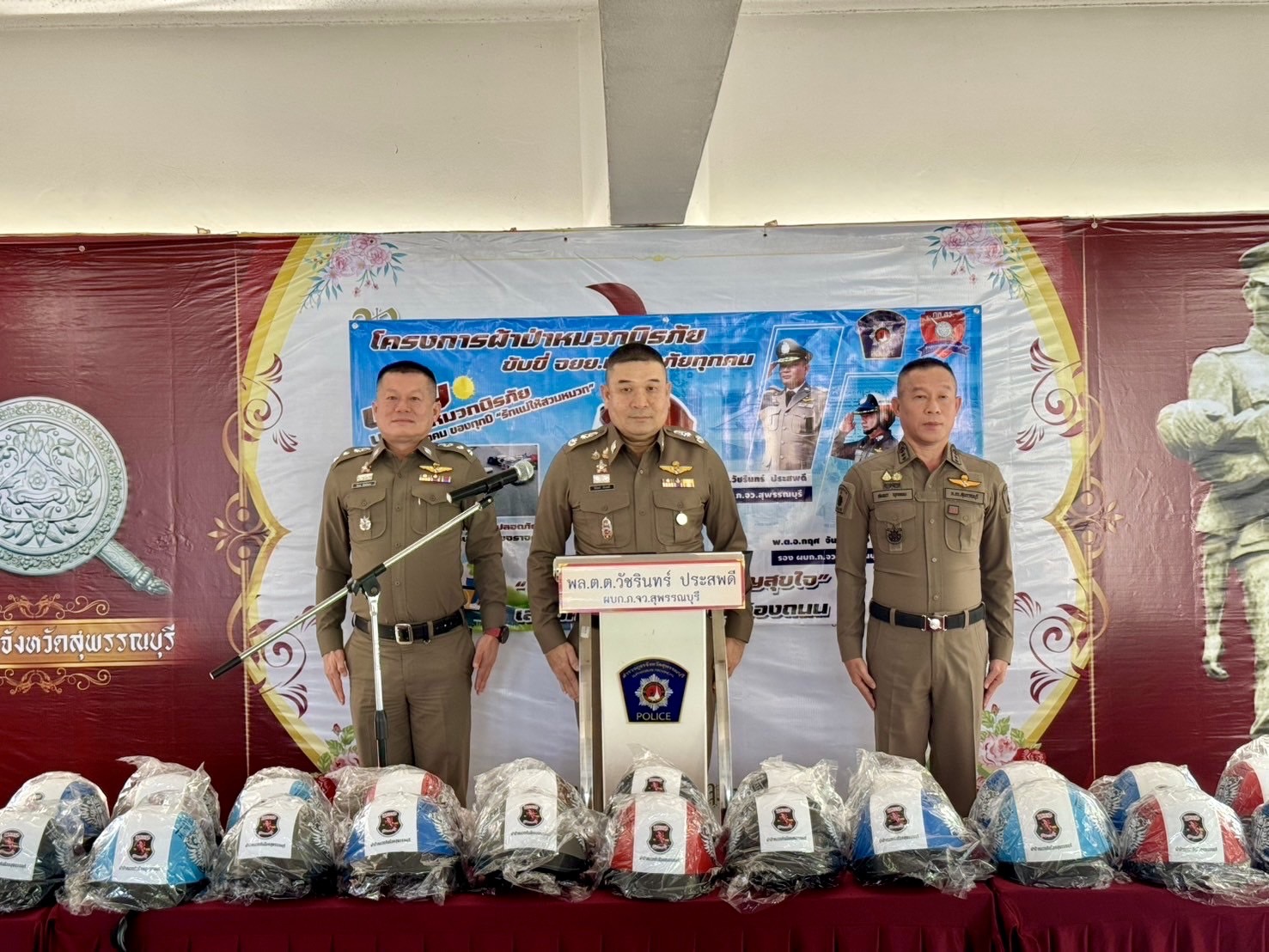 วันที่ 27 ก.ย.67 เวลา 09.45 น. พล.ต.ต.วัชรินทร์ ประสพดี ผบก.ภ.จว.สุพรรณบุรี เป็นประธาน พิธีมอบหมวกนิ