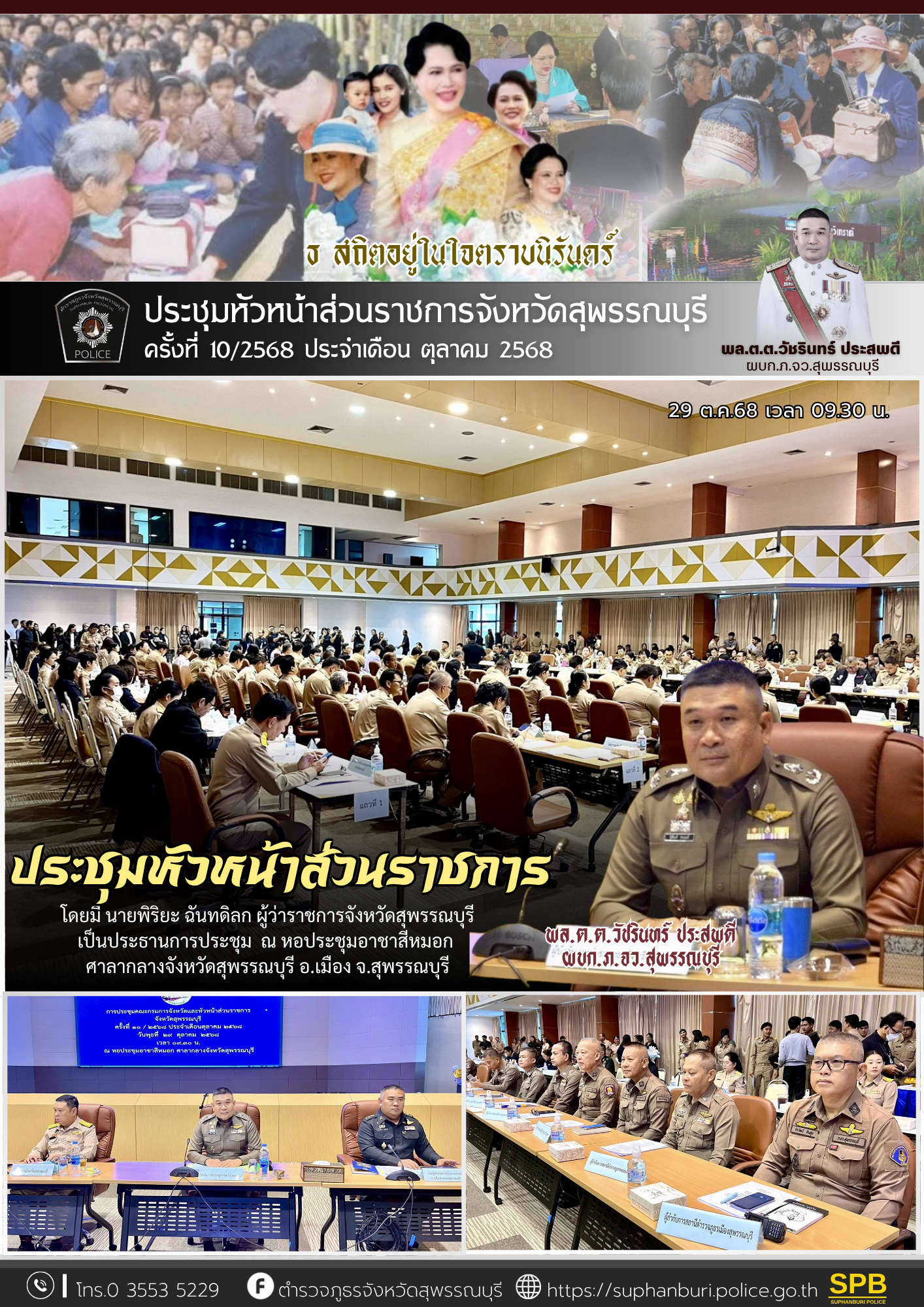 วันที่ 29 ต.ค.68 เวลา 09.30 น. พล.ต.ต.วัชรินทร์ ประสพดี ผบก.ภ.จว.สุพรรณบุรี เข้าร่วมประชุมหัวหน้าส่ว