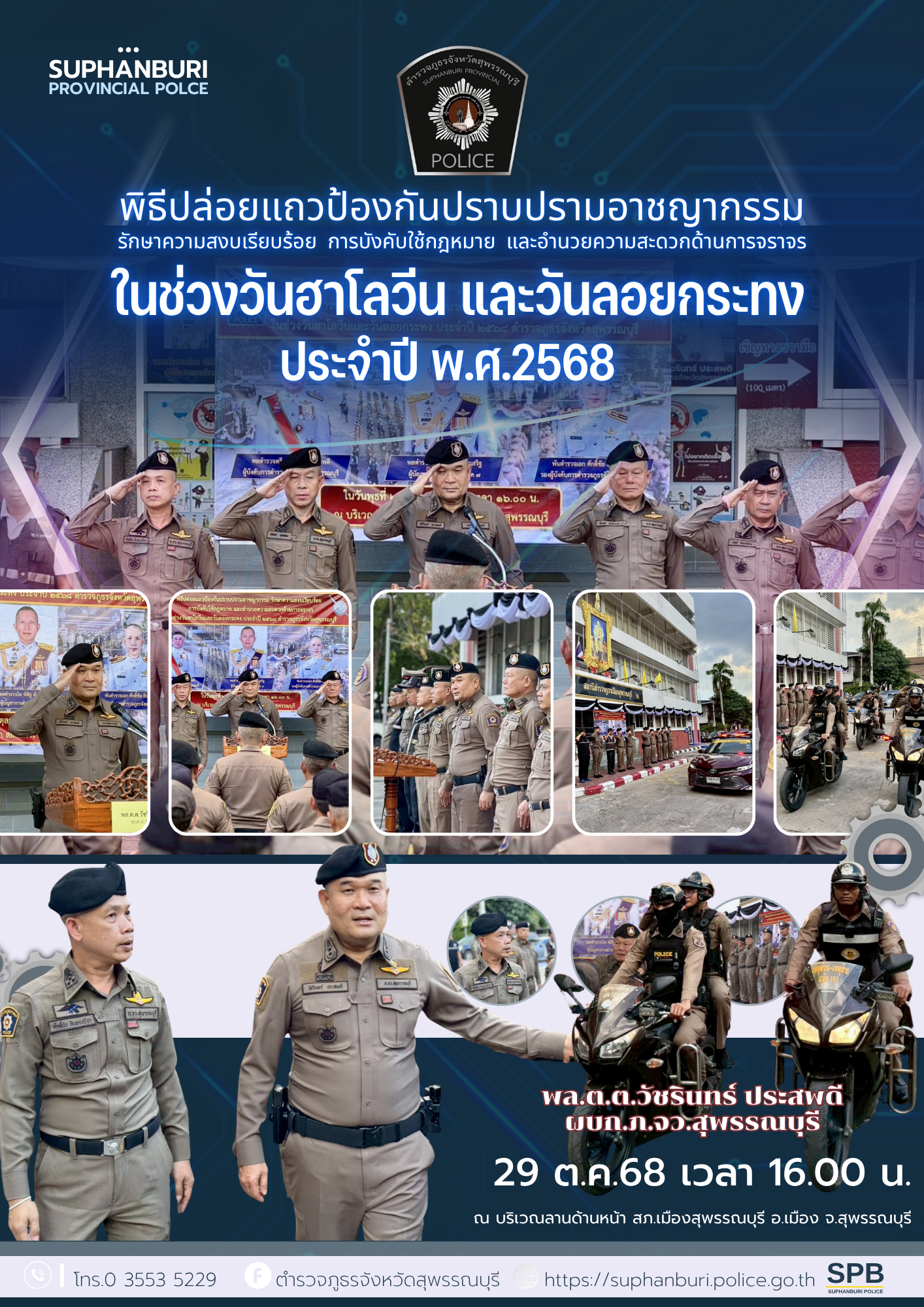 วันที่ 29 ต.ค.68 เวลา 16.00 น. พล.ต.ต.วัชรินทร์ ประสพดี ผบก.ภ.จว.สุพรรณบุรีเป็นประธาน พิธีปล่อยแถวป้