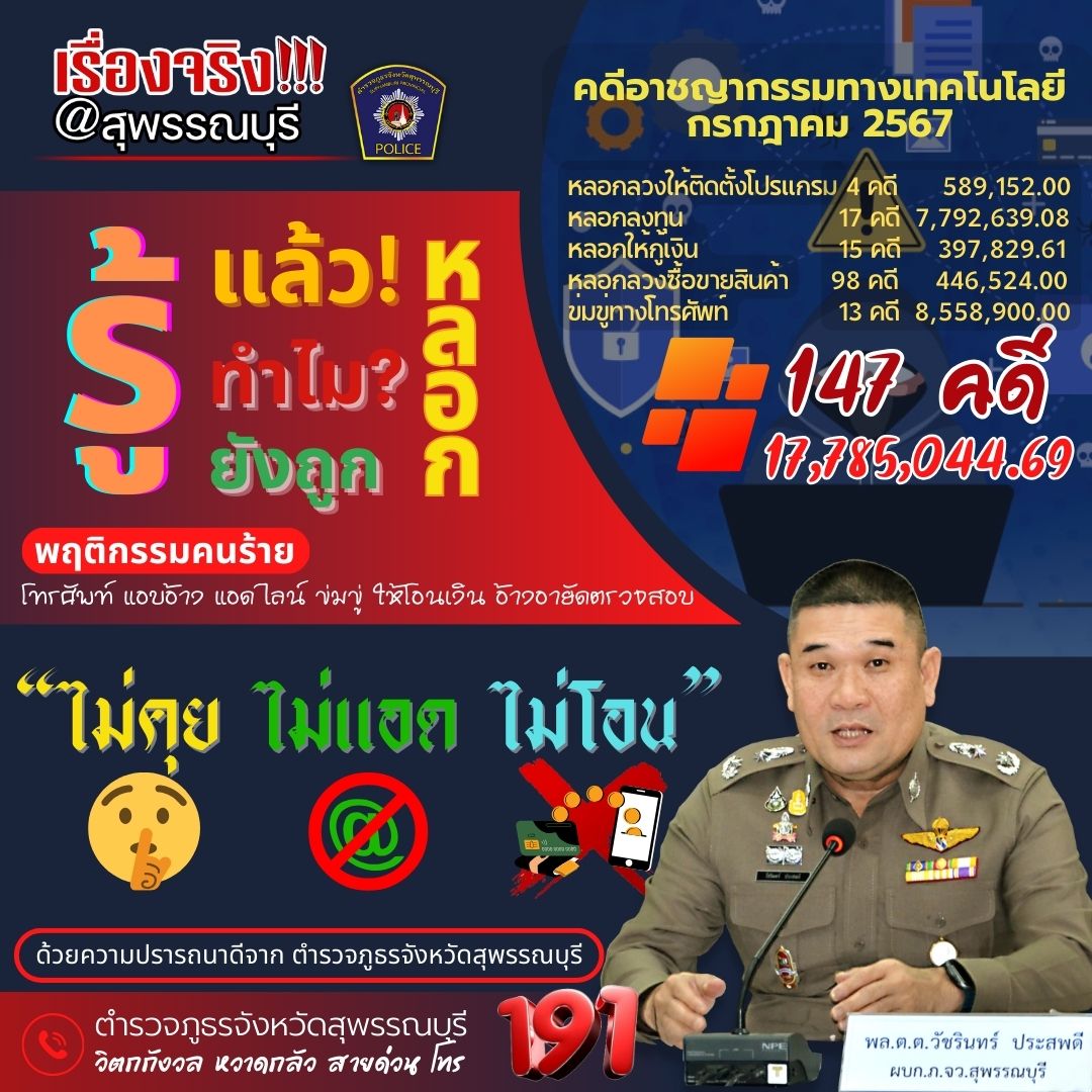 ตำรวจภูธรจังหวัดสุพรรณบุรี👮🏼 เตือนภัย‼️ “เรื่องจริง @สุพรรณบุรี” 🚨“รู้แล้ว! ทำไมยังถูกหลอก”🚨 ตามที่ต